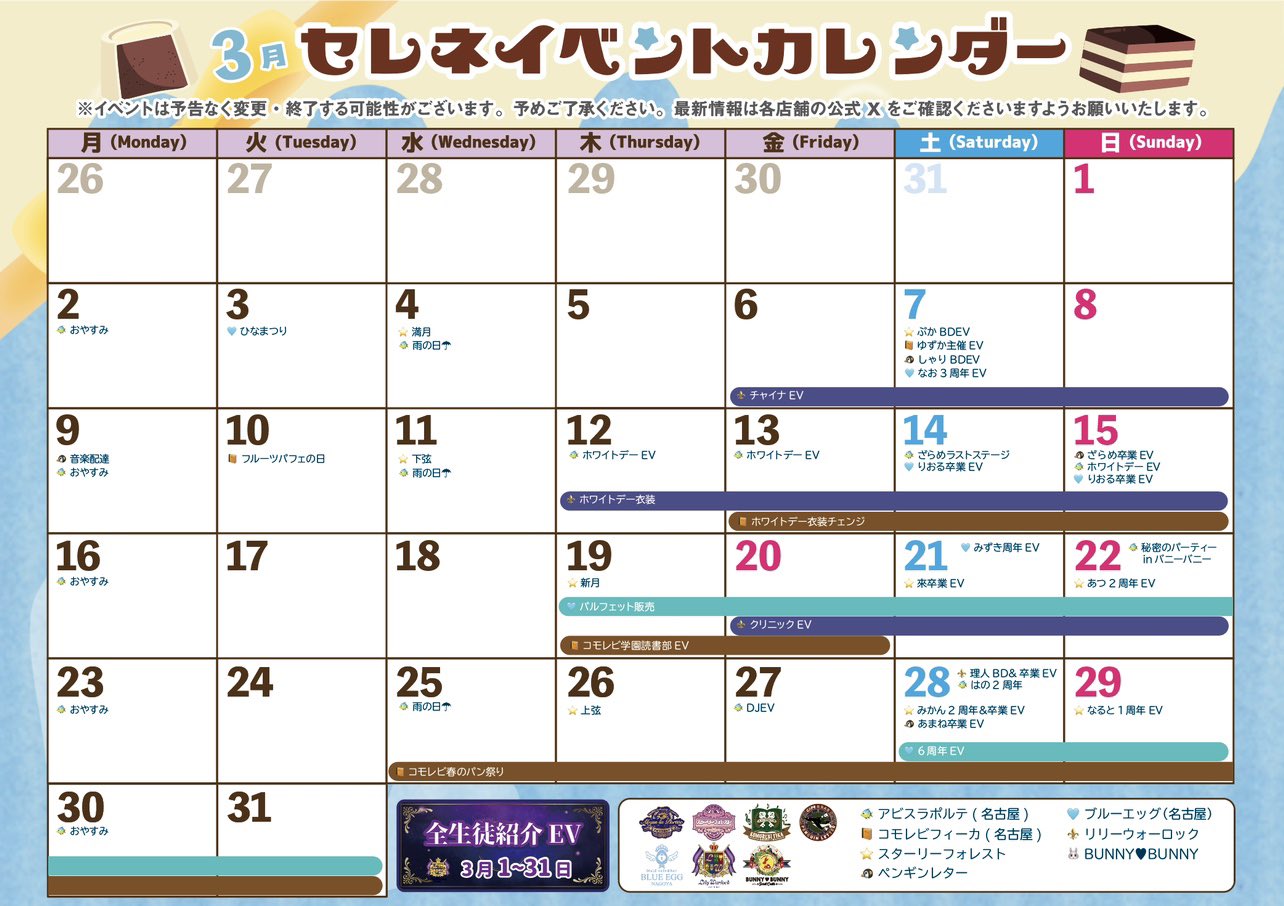 《3月イベントカレンダー》 1日~31日 全生徒紹介イベント🧙♂️ 6日~8日 チャイナイベント🐼 12日~15日 ホワイトデー衣装チェンジ🤍 20日~22日 リリークリニックイベント💉 28日 理人BD&卒業EV💫
